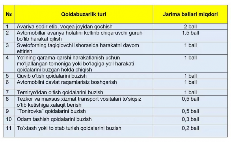 It is worth noting that the system for evaluating traffic violations based on penalty points came into effect in Uzbekistan on June 1 of this year. This was established by the Cabinet of Ministers’ Resolution ’’On introducing a system for evaluating traffic violations based on penalty points,’’ adopted on May 6.