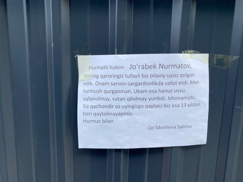 ’’Respected Mayor Jorabek Nurmatov, due to your decision, we have been left without a family home. My mother passed away wandering and suffering. I am married, and my younger brother is still homeless, unable to marry or serve his country. We hope that one day you will return to your home, while we have been unable to do so for 13 years. Best regards, Qoldosheva Salima,’’ the letter reads.
