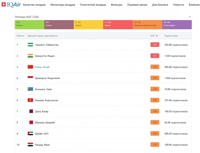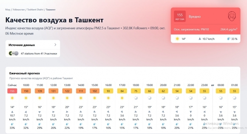 Today, October 6, the capital of Uzbekistan, Tashkent, ranked first among the world’s major cities in terms of air pollution. The data was reported by the IQAir portal.