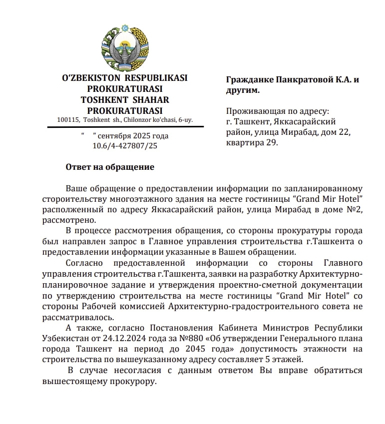 Reports circulated on social media claiming that a 30-storey business centre would be built on the site of the Grand Mir Hotel in the Yakkasaray district of Tashkent. However, such a project has neither been reviewed nor approved. This was stated in the response letter of the Tashkent City Prosecutor’s Office to a citizen’s inquiry.