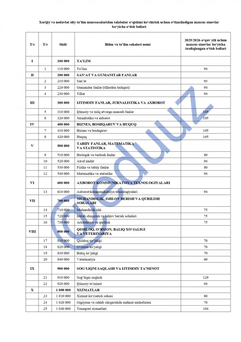 By the order of the Minister of Higher Education, Science, and Innovation, the passing scores for special tests required to transfer students from foreign and non-state higher education institutions to state universities in Uzbekistan for the 2025–2026 academic year have been approved. The announcement was made by the Ministry of Higher Education, Science, and Innovation.