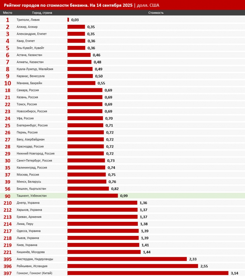 Currently, among 397 cities worldwide, Uzbekistan’s capital, Tashkent, ranks 90th for the cheapest gasoline, with an average price of $0.99 per liter. Among the CIS cities included in the ranking, the lowest prices were recorded in Astana ($0.46), while the highest were in Chisinau ($1.44).