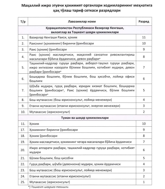 - Қорақалпоғистон Республикаси Вазирлар Кенгаши ва вилоятлар ҳокимликлари ходимларига 1,4 баравар;