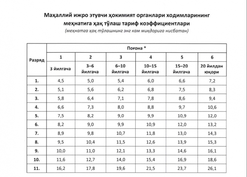 Меҳнатга ҳақ тўлашнинг энг кам миқдорига нисбатан ҳақ тўлаш тариф коэффициентлари бўйича поғона ходимнинг умумий иш стажидан келиб чиқиб аниқланади. Бунда ходимнинг умумий иш стажи 3 йилгача бўлганда 1-поғонага, 3 йилдан 6 йилгача 2-поғонага, 6 йилдан 10 йилгача 3-поғонага, 10 йилдан 15 йилгача 4-поғонага, 15 йилдан 20 йилгача 5-поғонага, 20 йилдан ортиғи 6-поғонага мос келади.