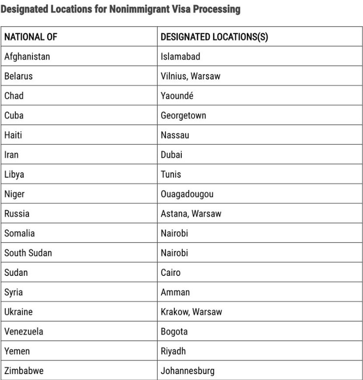 Бундай визалар берилиши тўхтатилган 17 давлат фуқаролари учун ариза топширишлари мумкин бўлган айрим элчихоналар ва консулликлар белгиланган. Шундай қилиб, россияликлар буни фақат АҚШнинг Остона ва Варшавадаги элчихоналарида, Беларусь фуқаролари – Варшава ёки Вильнюсда, украиналиклар – Варшава ва Краковда қилишлари мумкин. Шу пайтгача исталган давлатда суҳбатдан ўтиш ва ушбу турдаги виза олиш учун ариза топшириш мумкин эди.