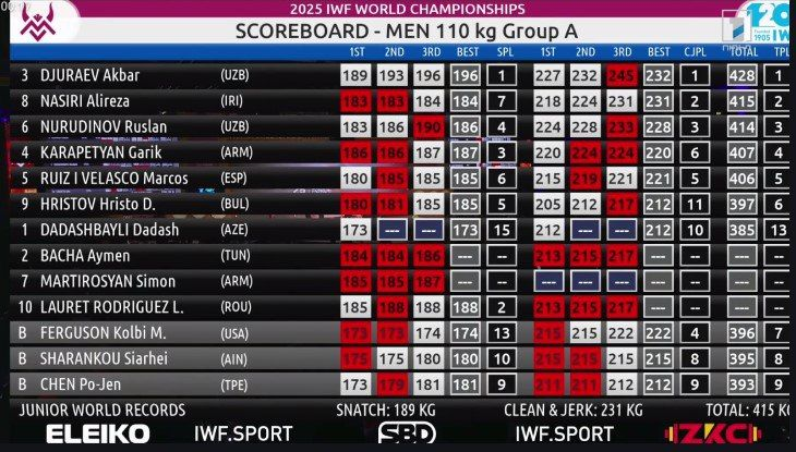 -110 kg vazn toifasidagi bellashuvlarda qatnashgan Akbar Jo‘rayev dast ko‘tarish mashqida 196 kg, siltab ko‘tarishda esa 228 kg natija bilan dunyo rekordlarini yangiladi. Jo‘rayev har ikki yo‘nalish va umumiy hisob bo‘yicha jami 3 ta oltin medalni qo‘lga kiritib, 3 karra jahon chempioniga aylandi. U 2021 va 2023 yilgi turnirlarda ham g‘olib bo‘lgandi.
