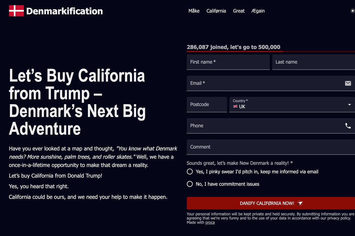АҚШнинг Гренландияни аннексия қилиш қарори ортидан Даниянинг Калифорнияни “сотиб олиши” ҳақидаги сатирик петицияси кенг тарқалиб, унга 200 000 дан ортиқ данияликлар имзо чекди. Бу ҳақда “Independent” нашри хабар берди.