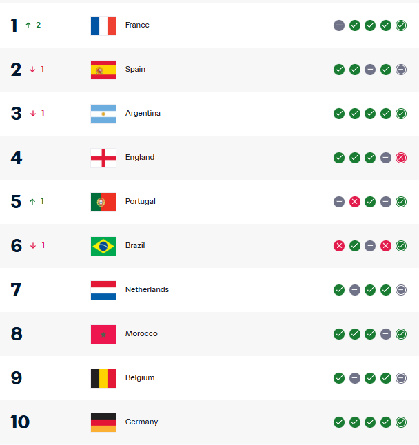 FIFA рейтингининг кучли ўнталигига юқорида айтиб ўтилган жамоалардан ташқари, Англия, Португалия, Бразилия, Нидерландия, Марокаш, Бельгия ва Германия терма жамоалари киради.