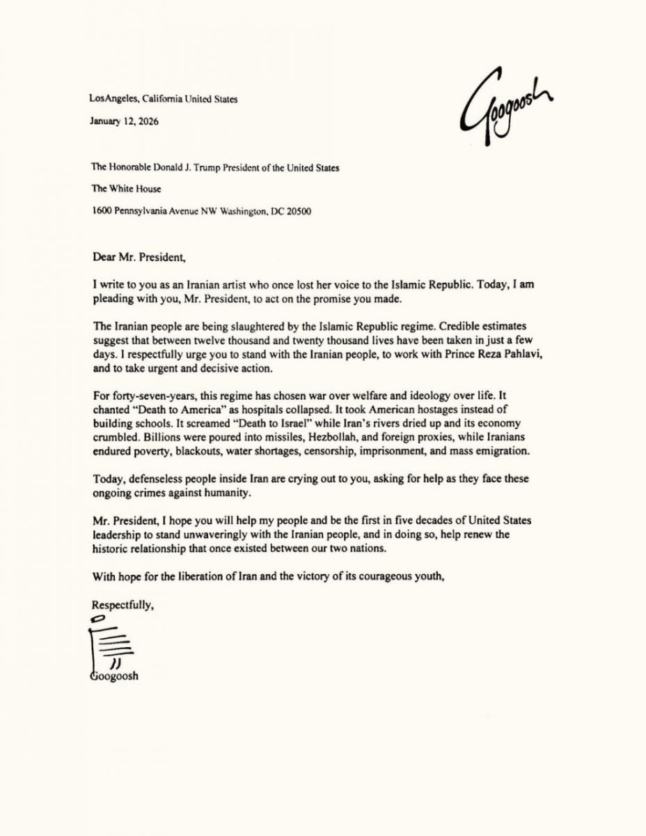АҚШнинг Лос-Анжелес шаҳрида яшаб келаётган форс ретро юлдузи Гоогоош Америка Қўшма Штатлари Президенти Дональд Трампга хат ёзиб, ундан шаҳзода Ризо Паҳлавий билан ҳамкорлик қилиш ва Эроннинг амалдаги ҳукуматига қарши кескин чора кўришни сўради. У ўз мактуби илова қилинган постни ижтимоий тармоқдаги саҳифасига жойлади.
