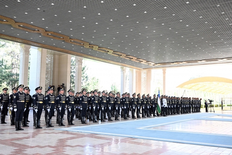 Қайд этилишича, Президент Шавкат Мирзиёев олий мартабали меҳмонни самимий қутлаб, шоҳсупага таклиф этган.
