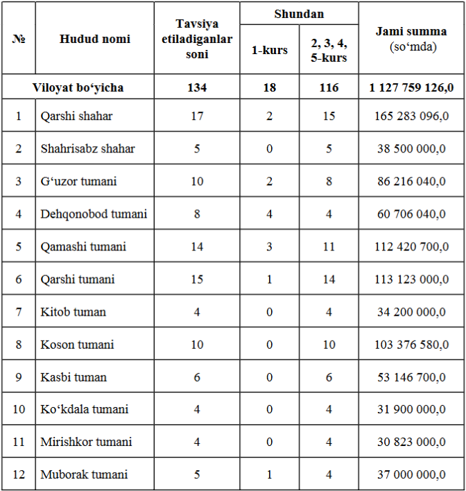 Ҳужжатга кўра, вилоят бўйича 134 нафар, хусусан, 18 нафар 1-курс, 116 нафар юқори курс талабаларининг қарийб 1 млрд 128 млн сўмлик тўлов-контракт пуллари тўлаб берилган.