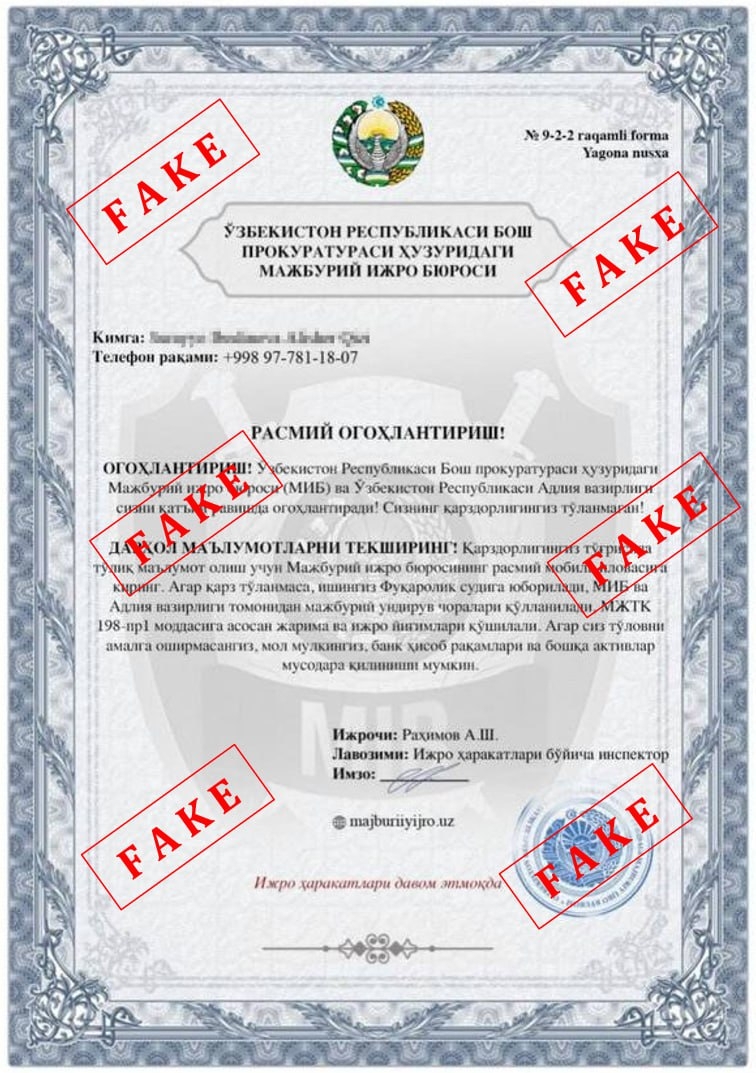 Мажбурий ижро бюроси номидан ижро ҳужжати ёки қарздорлик ҳақидаги фейк хабарлар юборилиши ҳолатлари кузатилмоқда. Бу ҳақда Бош прокуратура матбуот котиби Ҳаёт Шамсутдинов маълум қилди.