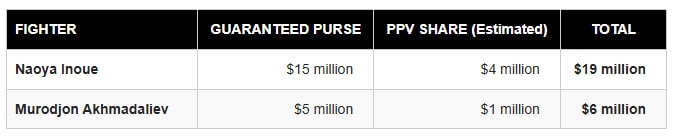 Иноуэ-Аҳмадалиев жанги учун умумий гонорар тахминан 20 миллион доллар этиб белгиланган бўлиб, бу ерда Иноуэ “А томони” сифатида 75/25 нисбатда тақсимотдан фойдаланади. Иноуэ ўз фаолиятидаги энг катта гонорарини – 15 миллион долларни қўлга киритиши кутилмоқда. Унинг аввалги энг катта гонорари Е Жоон Кимга қарши жангда бўлиб, ўшанда 7 миллион доллар ишлаб топган.