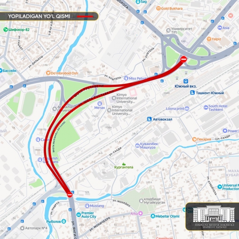 According to the information, from 17:00 on September 26 until 07:00 on September 29, traffic will be temporarily restricted for vehicles in the direction of South station – Sergeli (’’Ozgarish’’ bridge) as road maintenance works are carried out.