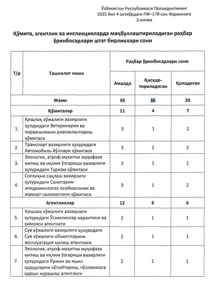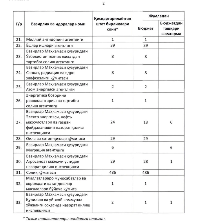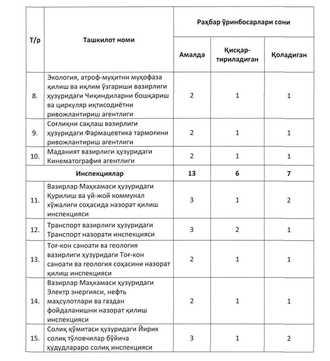 Фармон кўра, ижро ҳокимиятининг 2141 та штат бирлиги, жумладан, бюджет ташкилотларидан 1863 та, бюджетдан ташқари жамғармадан эса 278 та лавозим штат жадвалидан чиқарилади. Шунингдек, қўмита, агентлик ва инспекцияларда раҳбар ўринбосарлари сони жами 16 тага қисқартирилади.