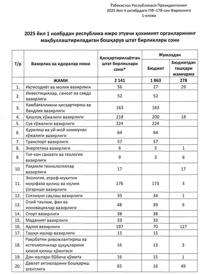 Ўзбекистонда жорий йилнинг 1 ноябридан республика ижро этувчи ҳокимият органларининг жами 2141 та штати қисқартирилади. Бу ҳақда Президентнинг 4 октябрь куни қабул қилинган “Республика ижро этувчи ҳокимият органларининг фаолиятига рақамлаштиришни кенг жорий этиш ҳисобига бошқарув штат бирликлари сонини мақбуллаштириш чора-тадбирлари тўғрисида”ги фармонида сўз боради.