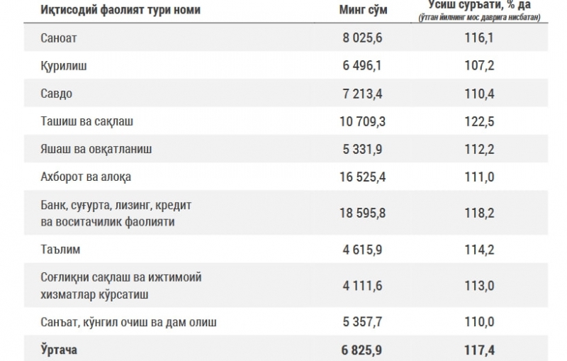 Ўзбекистонда энг кўп ойлик банк, суғурта, лизинг, кредит ва воситачилик соҳаларига берилган. Бу таҳминан 18,6 миллион сўмни ташкил этмоқда.
