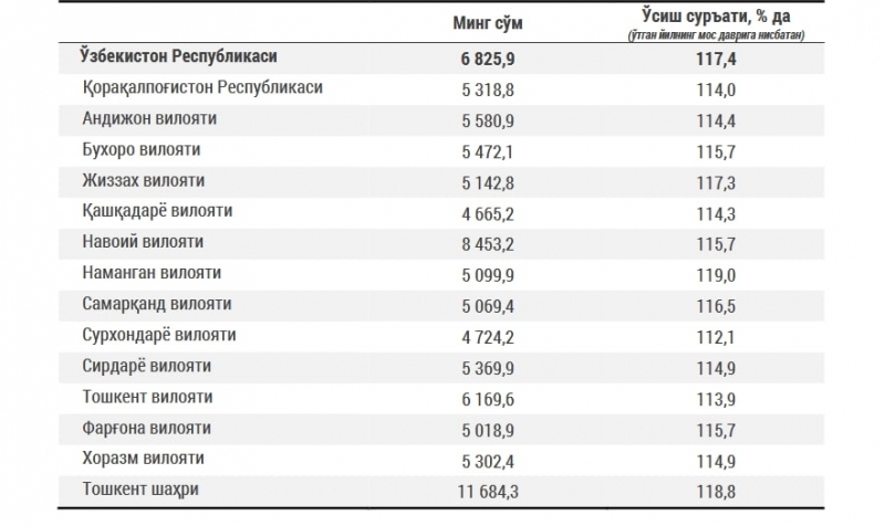 Маълум қилинишича, Тошкент шаҳри Республика бўйича энг кўп ойлик тўланадиган ҳудуд бўлиб қолган. Ўртача ҳисобда пойтахтда 11,7 миллион сўм ойлик олинмоқда. Кейинги ўринни 8,45 миллион сўм билан Навоий вилояти эгаллаган.
