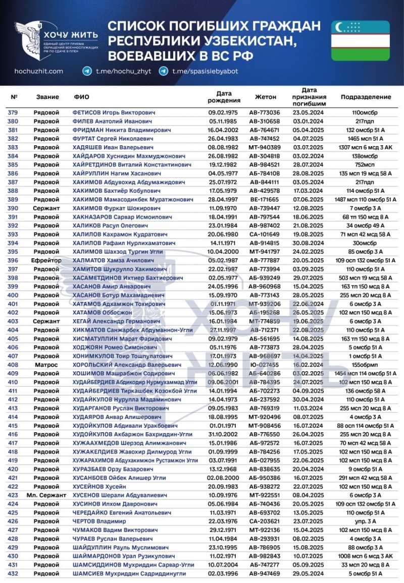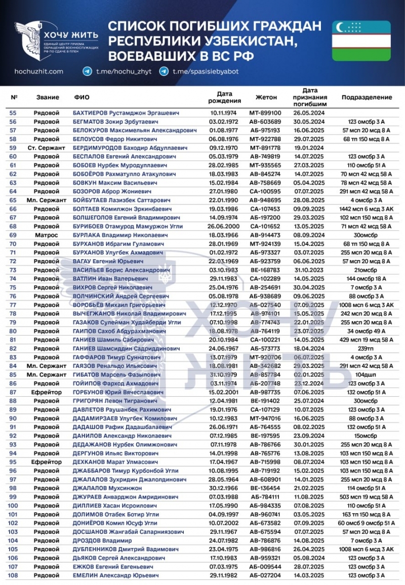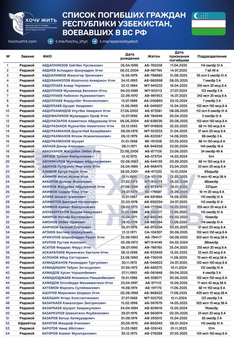 Украина Мудофаа вазирлиги ва Бош разведка бошқармаси кўмагида ташкил этилган “Хочу жить” (“Яшашни хоҳлайман”) лойиҳаси Украинага қарши урушда қатнашиш учун Россия Қуролли кучлари сафида ёлланиб, ҳалок бўлган ёки бедарак йўқолган 481 нафар Ўзбекистон фуқаросининг исм-шарифини эълон қилди. Рўйхат лойиҳанинг ижтимоий тармоқлардаги саҳифаларида эълон қилинди.