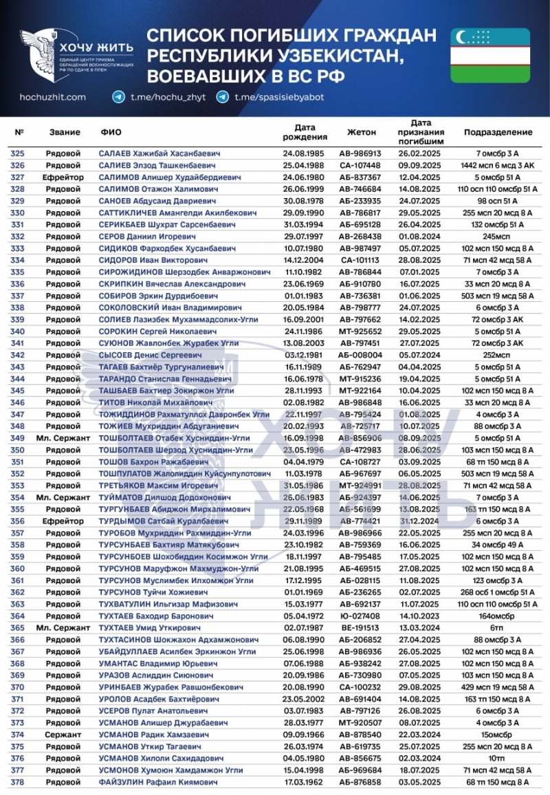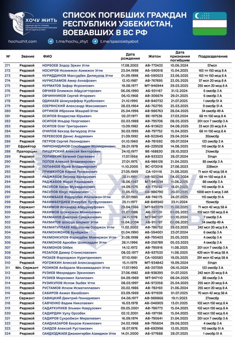 Эслатиб ўтамиз, аввалроқ Украина Мудофаа вазирлиги ва Бош разведка бошқармаси кўмагида ташкил этилган “Хочу жить” (“Яшашни хоҳлайман”) лойиҳаси Украинага қарши урушда қатнашиш учун Россия Қуролли кучлари билан шартнома имзолаган 902 нафар Ўзбекистон фуқаросининг исм-шарифини эълон қилганди.