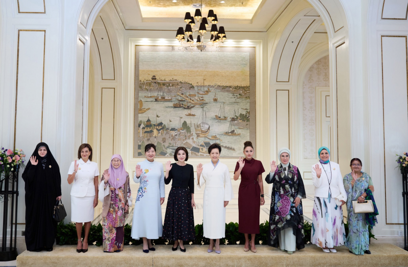 Етакчиларнинг турмуш ўртоқлари учун ўтказилган тадбирларга Хитой Раиси Си Цзиньпиннинг рафиқаси Пинг Лиюень мезбонлик қилди. Дастлаб у биринчи хонимларни илиқ кутиб олди. Раҳбарларнинг рафиқалари маданий дастурга боришдан олдин оилавий суратга тушди. Дастур давомида улар ўз давлатларининг маданий бойликлари ҳақида маълумот алмашди. Шундан сўнг биринчи хонимлар Хайхе дарёси бўйлаб махсус кемада саёҳат қилди.