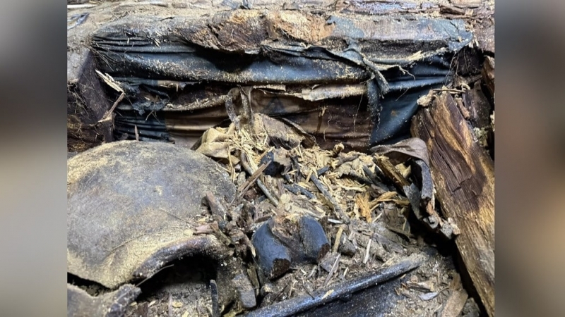 “Qazilgan qabrning qurbonlik zonasida o‘ta qiziqarli osori atiqalar topildi. Eng qizig‘i shundaki, har birida ikkitadan qalin yog‘och bo‘lgan, bir-biriga parallel bo‘lgan 7 santimetr qalinlikdagi ko‘k va sariq rangli matoga o‘ralgan, bu juda yaxshi saqlangan, hatto tobut boshidagi matoga qora siyoh bilan chizilgan chizmalar va belgilar juda aniq ko‘rinadi.