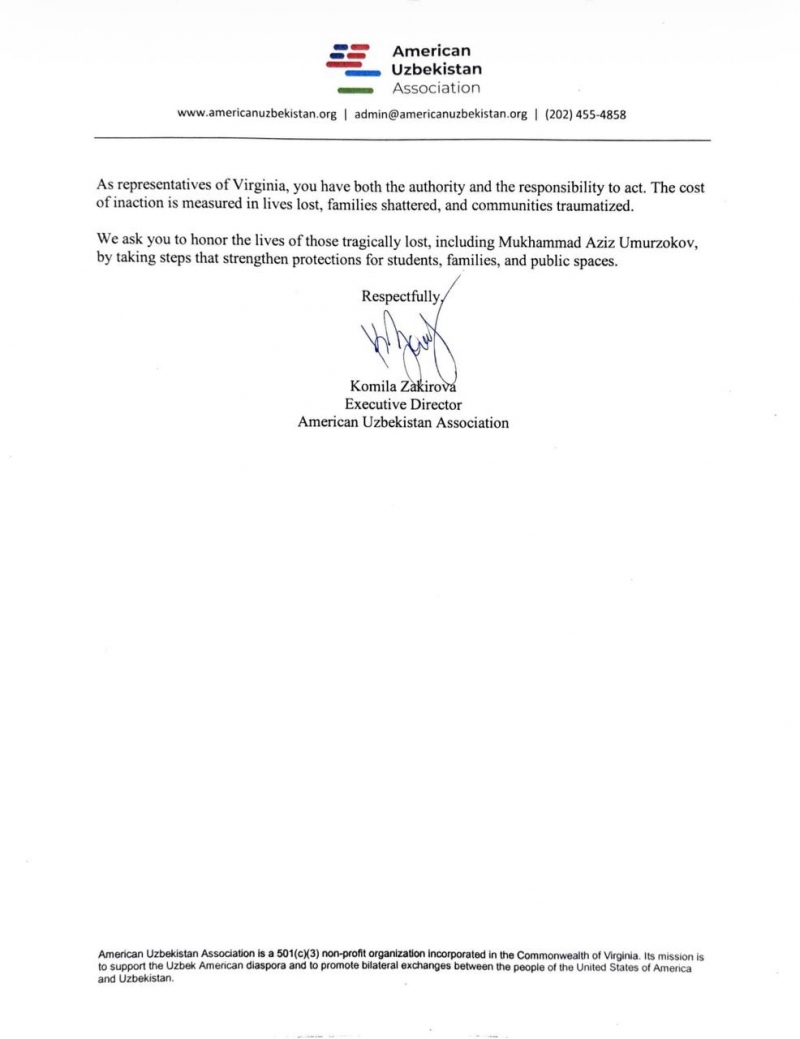 “Biz bu murojaatni Braun universitetidagi otishma qurbonlari, jumladan yosh o‘zbekistonlik talaba va Virjiniya rezidenti Muhammadaziz Umurzoqovning xotirasiga bag‘ishlab, butun mamlakat bo‘ylabqurolli zo‘ravonlikdan jabr ko‘rgan oilalar bilan birdamlikda yozdik. Bizning murojaatimiz amerikalik o‘zbek oilalar hamda maktablar, jamoat joylari va xonadonlar xavfsizligi haqida qayg‘urayotgan barcha ota-onalarning tashvishini aks ettiradi”, deyiladi xabarda.