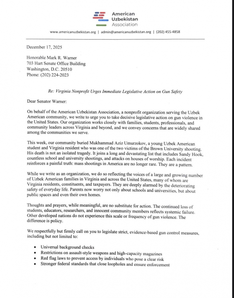 Avvalroq, AQSHning Rod-Aylend shtati Providens shahridagi Braun universitetida sodir bo‘lgan otishma oqibatida o‘zbekistonlik talaba Muhammadaziz Umurzoqov halok bo‘lgani haqida xabar berilgandi. Ushbu holat ortidan AQSHdagi Amerika-O‘zbekiston Assotsiatsiyasi Virjiniya shtatidan saylangan senatorlar va Kongress a’zolariga qurolli zo‘ravonlikka qarshi qat’iy qonunchilik choralarini ko‘rishga chaqirib maktub yubordi. Bu haqda assotsiatsiyasining Telegram-kanalida xabar berildi.