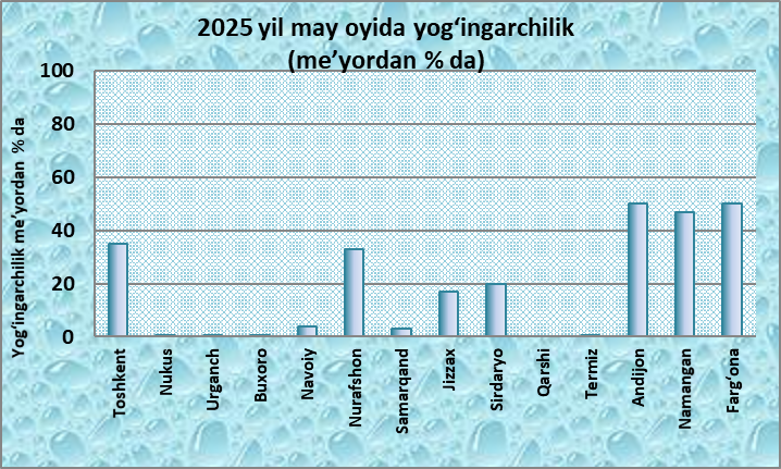 2025 yil may oyida o‘rtacha oylik havo harorati iqlim me’yoridan 2,5-4,5 darajaga yuqori bo‘lgan. Respublikaning barcha hududlari bo‘yicha o‘tgan may oyi eng iliq may oylari uchligiga kirgan.