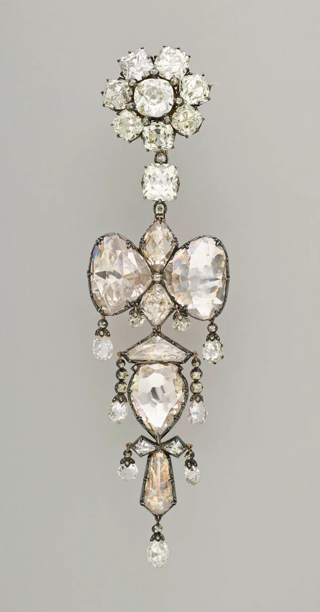 Katta brilliantlar brosh markazida bir-biriga qarshi joylashgan. Oltin broshning orqa tomoni o‘simlik va barg naqshlari bilan ajoyib o‘yib bezatilgan. U 1887 yili Luvr tomonidan sotib olingan.
