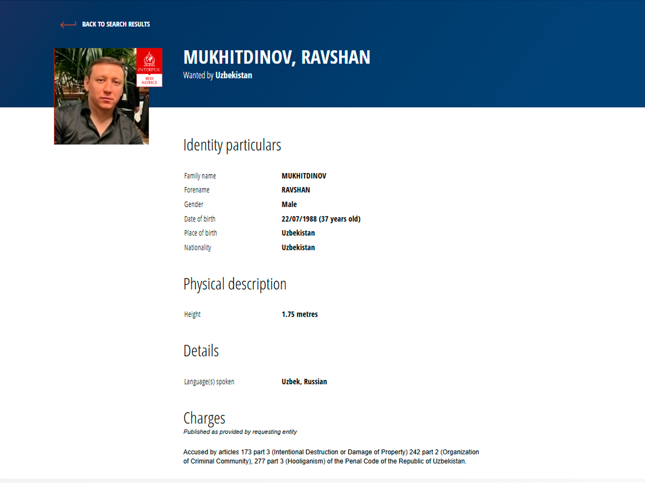 “Ravshan zolotoy” laqabi bilan tanilgan o‘zbekistonlik Ravshan Muhitdinov O‘zbekiston Respublikasi Ichki ishlar vazirligi so‘rovi bilan Interpol orqali xalqaro qidiruvga berildi. Bu haqdagi e’lon Interpol saytida paydo bo‘ldi.