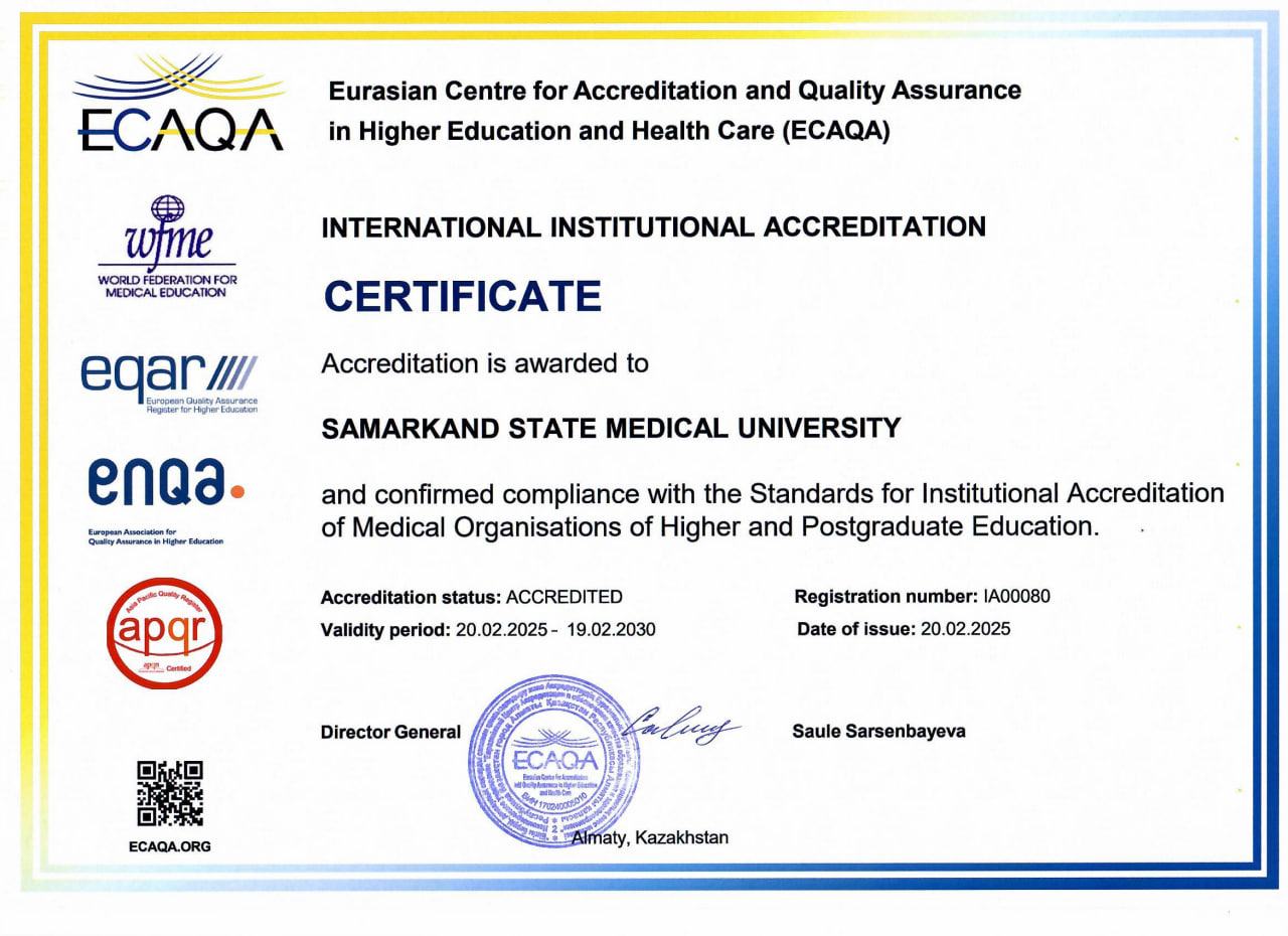 Xulosa qilib aytganda, mamlakatimizdagi yana bir oliy ta’lim muassasasining xalqaro darajada tan olinishi nafaqat Samarqand davlat tibbiyot universiteti, balki butun O‘zbekiston oliy ta’lim tizimi uchun ham muhim qadam hisoblanadi.