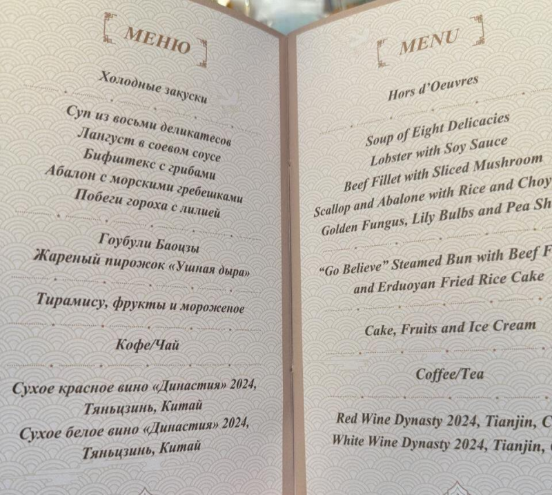 Asosiy taomga mashhur bug‘da pishirilgan “Goubuli“ go‘shtli bulochkalari va “Igna qulog‘i” g‘ayrioddiy nomli qovurilgan taom kiritilgan. Shirinlik uchun tiramisu, sarxil mevalar va muzqaymoq taklif qilindi.