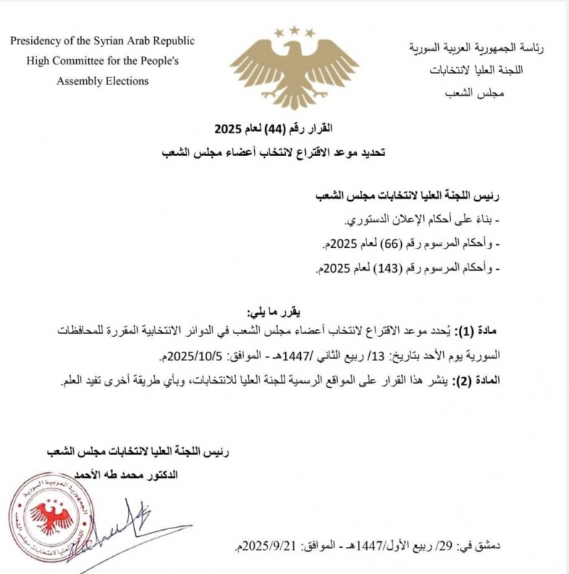 Suriyada mamlakatning sobiq prezidenti Bashar Asad hukumati ag‘darilganidan keyin birinchi parlament saylovlari joriy yilning 5 oktyabr kuni bo‘lib o‘tadi. Bu haqda SANA xabar berdi.