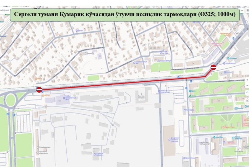 Qayd etilishicha, 2025-2026 yilgi kuz-qish mavsumiga tayyorgarlik doirasida Sergeli tumanining Qumariq ko‘chasida diametri 325 mm bo‘lgan issiqlik tarmoqlarining umumiy 1000 metr uzunlikdagi qismi almashtiriladi. Ishlar pudrat tashkiloti tomonidan joriy yilning 10-30 sentyabr kunlari yo‘l qismi yopilgan holda amalga oshiriladi.