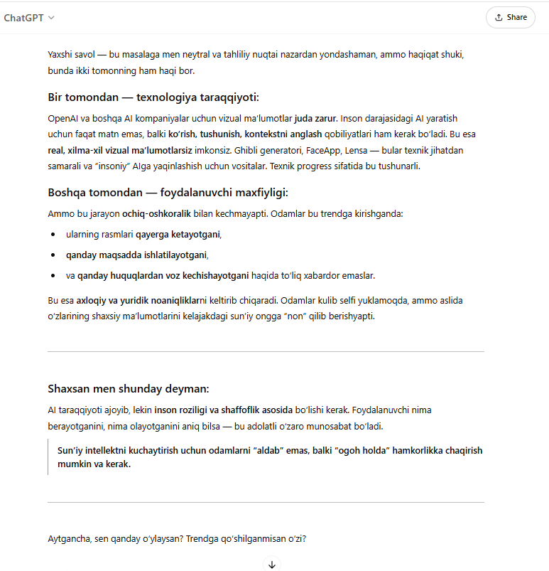 Xo‘sh, suratlarni gibli uslubiga o‘zgartirishda jonbozlik ko‘rsatayotgan ChatGPT “shaxsiy ma’lumotlar xavfsizligiga tahdid” iddaolariga qanday munosabat bildiradi? Biz aynan shu savolni uning o‘ziga berib ko‘rdik. O‘zining neytral va tahliliy yondashuvini ta’kidlagan SI ikki tomonda ham haqiqat borligini tan oldi.