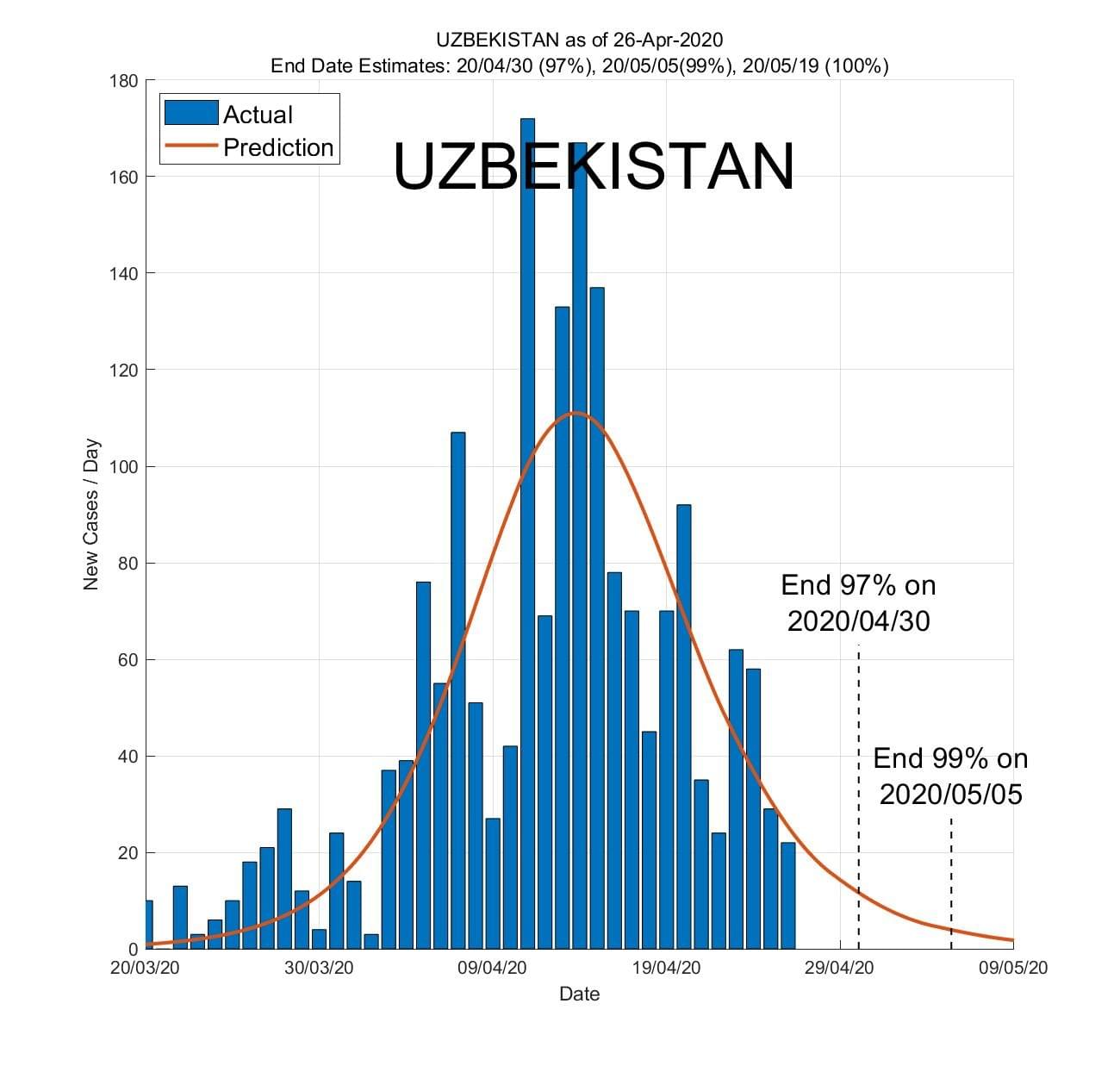 Olimlarning hisob kitobiga ko‘ra, O‘zbekistonda koronavirus bilan bog‘liq vaziyat 20 mayga qadar 100 foizga yakun topishi aytilmoqda. Butun dunyoda esa noyabr oyining oxirida tugashi ko‘rsatilgan. Qatar va Bahrayn davlatlarida kasallik 2021 yil boshida to‘liq bartaraf etilishi prognoz qilingan.