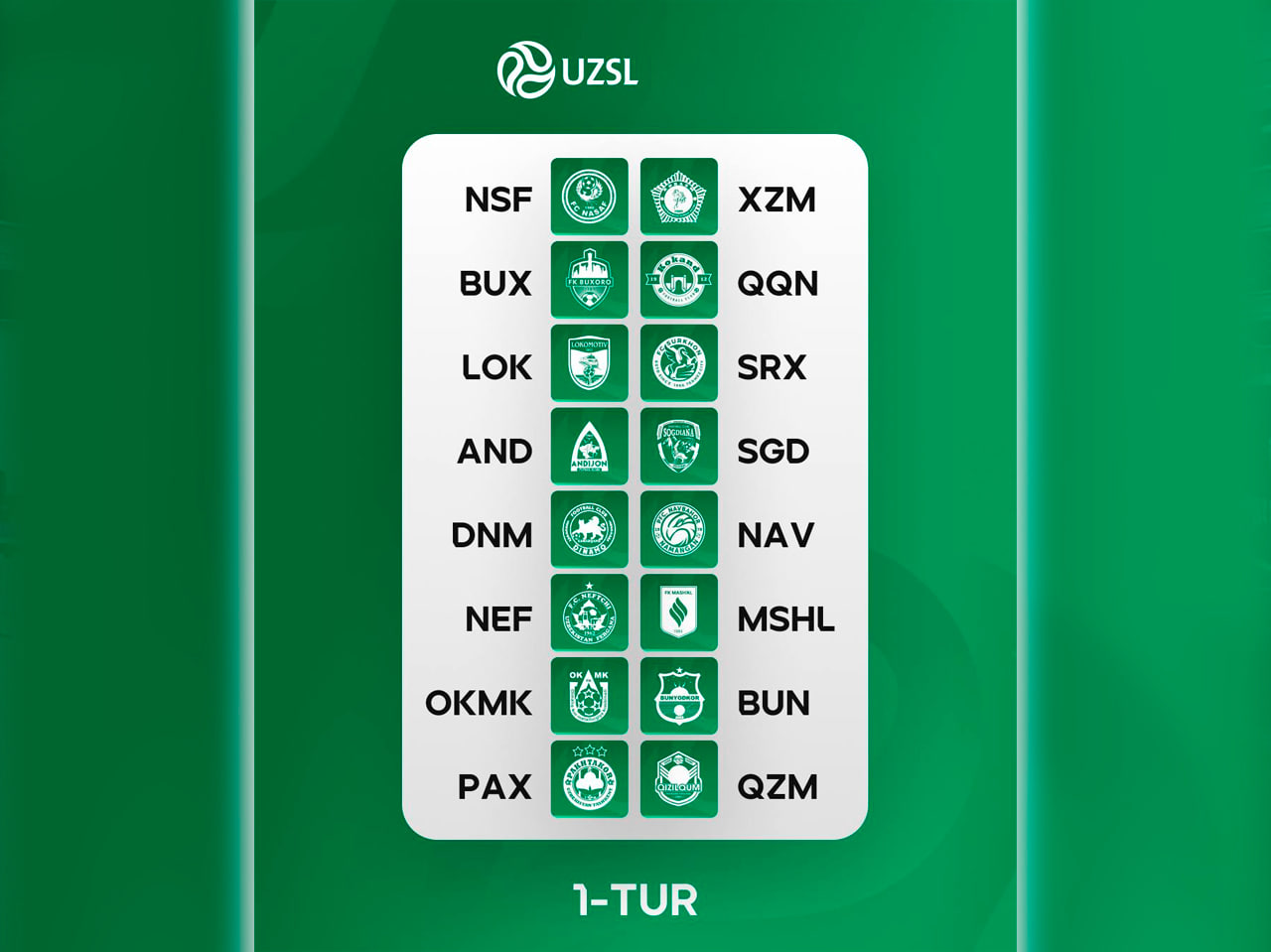 Qur’a ko‘ra, Superliga-2026 1-turi quyidagicha ko‘rinish oldi:
