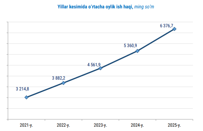 Qayd etilishicha, 2025 yil yanvar-dekabr oylarida o‘rtacha oylik nominal hisoblangan ish haqi 6 mln 376 ming so‘mni tashkil etib, o‘tgan yilning mos davriga nisbatan 18,9 foizga o‘sgan.