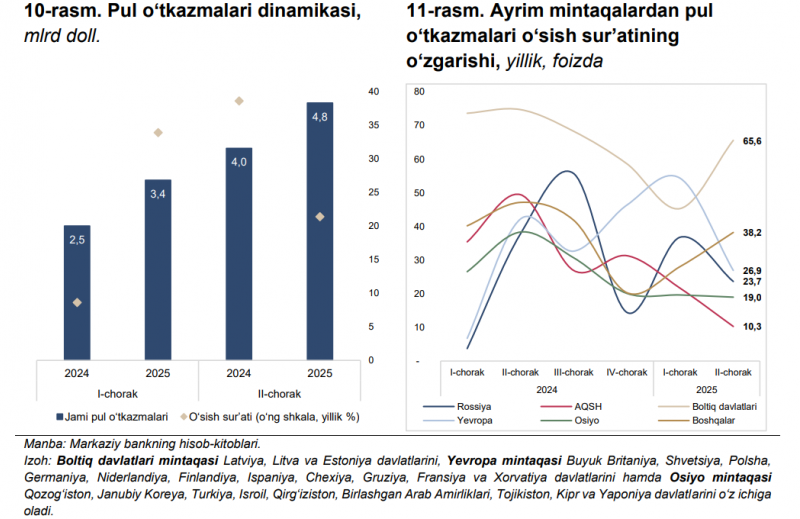 Shu bilan birga, II chorakda turli mintaqalardan jo‘natilgan pul o‘tkazmalari o‘sish sur’atining sezilarli o‘zgarishi kuzatilgan. Xususan, Boltiq davlatlari, Yevropa va boshqa mintaqalardan o‘tkazmalar hajmi o‘sish sur’ati qolgan mintaqalarga nisbatan yuqoriroq saqlanib qolgan. Bunda, ayniqsa Boltiq davlatlaridan pul o‘tkazmalarining sezilarli oshishi kuzatilib, o‘tgan yilning mos davriga nisbatan 65,6 foizga o‘sgan. Shuningdek, mazkur davrda AQSH, Rossiya va Yevropadan jo‘natilgan pul o‘tkazmalari o‘sishining pasayishi (mos ravishda 10,3, 23,7 va 26,9 foizgacha) kuzatilgan bo‘lsa, Osiyodan o‘tkazmalarning barqarorlashuvi saqlanib qolgan.