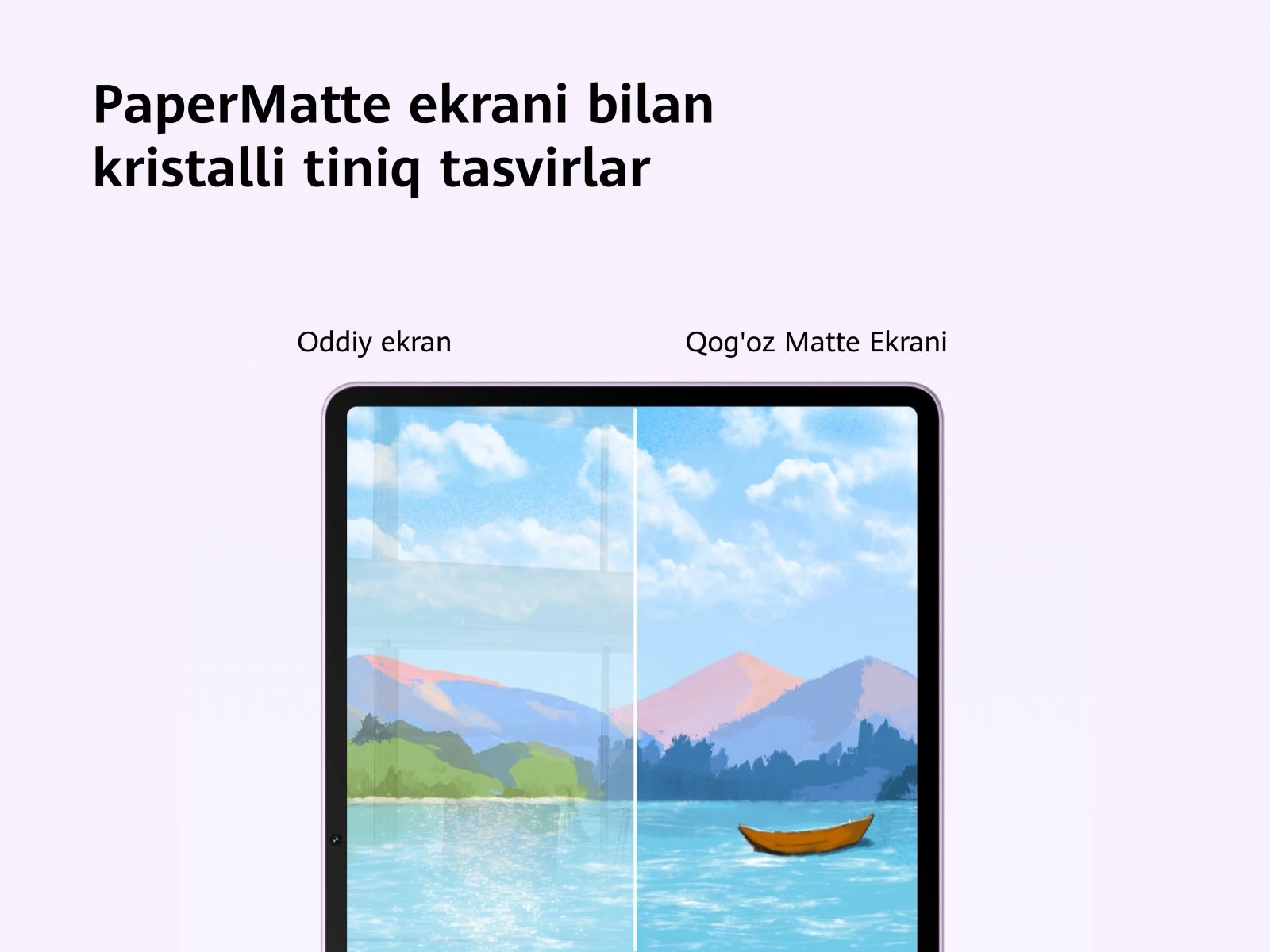 HUAWEI MatePad 11,5’’S’ning eng asosiy xususiyati — PaperMatte ekrani (bu ekran matli va yorug‘likni aks ettirmaydi, qog‘ozga o‘xshash ko‘rinish beradi). U maxsus texnologiya bilan ishlab chiqilgan, shu tufayli ekranda yorug‘likning aksini (blik) 99%gacha kamaytiradi.