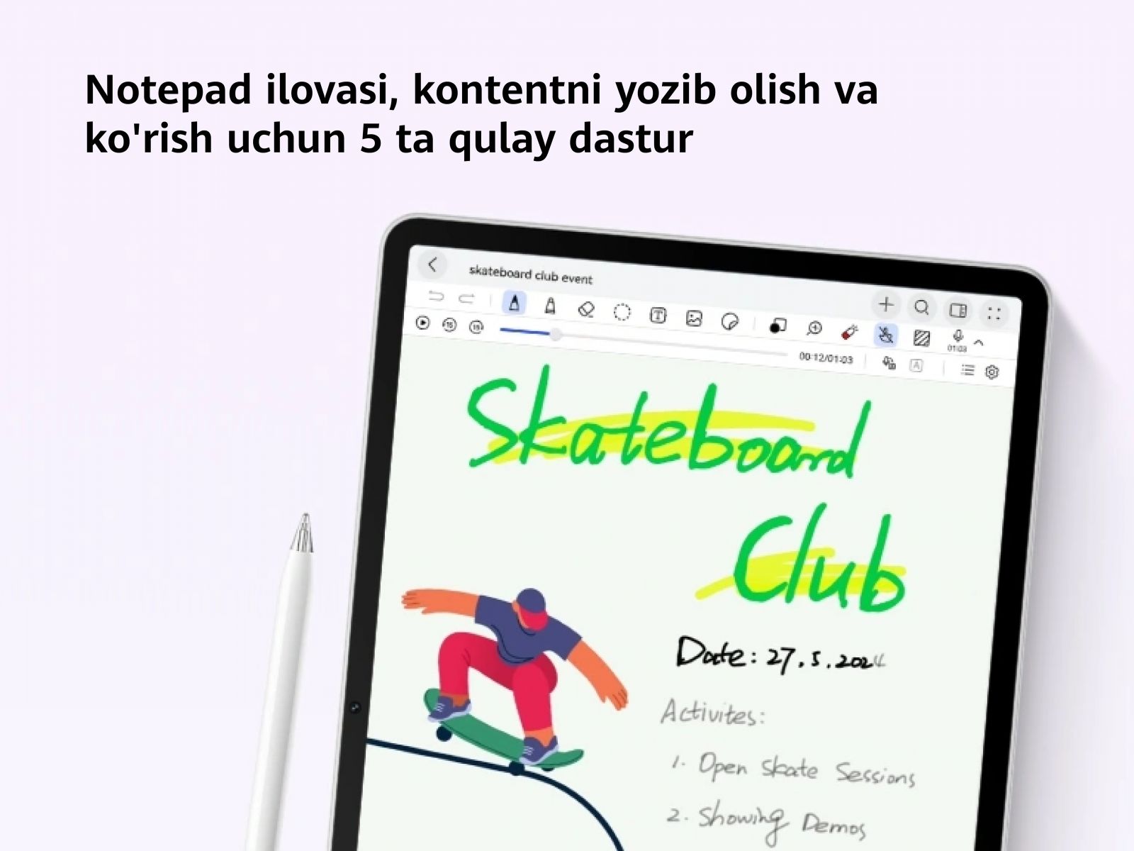 - M-Pencil orqali siz qo‘lyozma qaydlar, grafiklar, chizmalar va g‘oyalarni tabiiy usulda yozasiz. Har bir chiziq ekranda aniq ko‘rinadi.