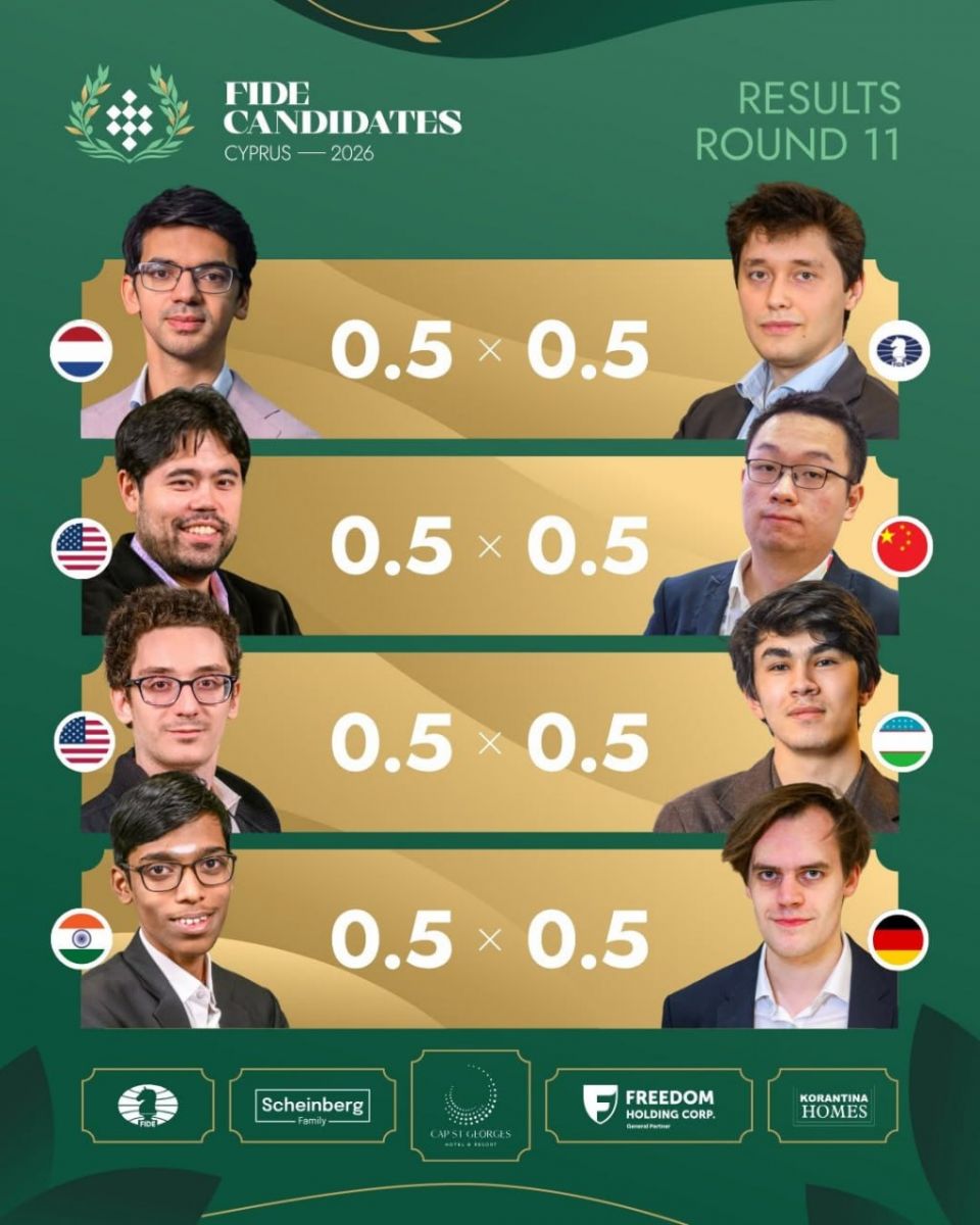 Bugun, 11 aprel kuni o‘zbekistonlik shaxmatchi Javohir Sindorov 2026 yilgi Nomzodlar turnirining 11-turida qora donalarda o‘ynab, amerikalik grossmeyster Fabiano Karuana bilan durang o‘ynadi. U hamon 8,5 ochko bilan turnirda yetakchilik qilmoqda.