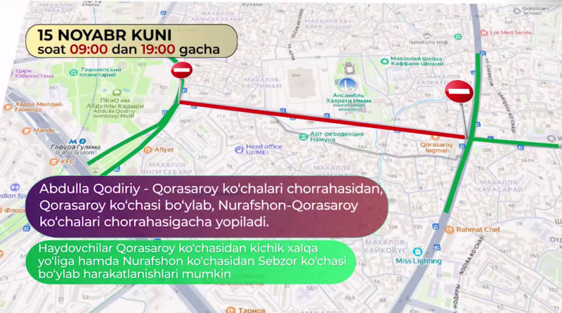 On the same day, from 9:00 to 19:00, the section from the Abdullah Qodiriy–Qorasaroy intersection along Qorasaroy Street to the Nurafshon–Qorasaroy intersection will be closed. Drivers will be able to use Qorasaroy Street to the Small Ring Road and Sebzor Street via Nurafshon Street as alternative routes.
