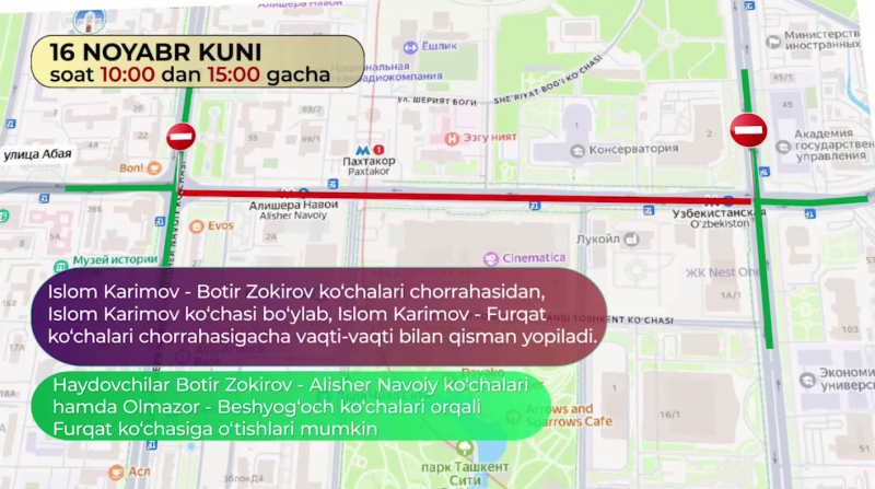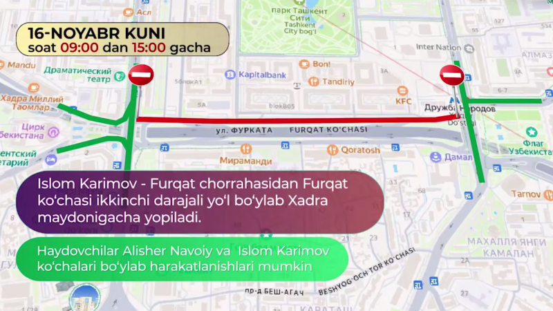 On November 16, from 9:00 to 15:00, the section from the Islom Karimov–Furqat intersection along Furqat Street to Hadra Square will be closed, and drivers can use Alisher Navoiy and Islom Karimov Streets as alternative routes.