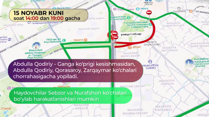 It is reported that on November 15 this year, from 14:00 to 19:00, the section from the Abdullah Qodiriy–Ganga Bridge intersection to the junction of Abdullah Qodiriy, Qorasaroy, and Zarqaynar streets will be closed. Drivers will be able to use Sebzor and Nurafshon streets as alternative routes.