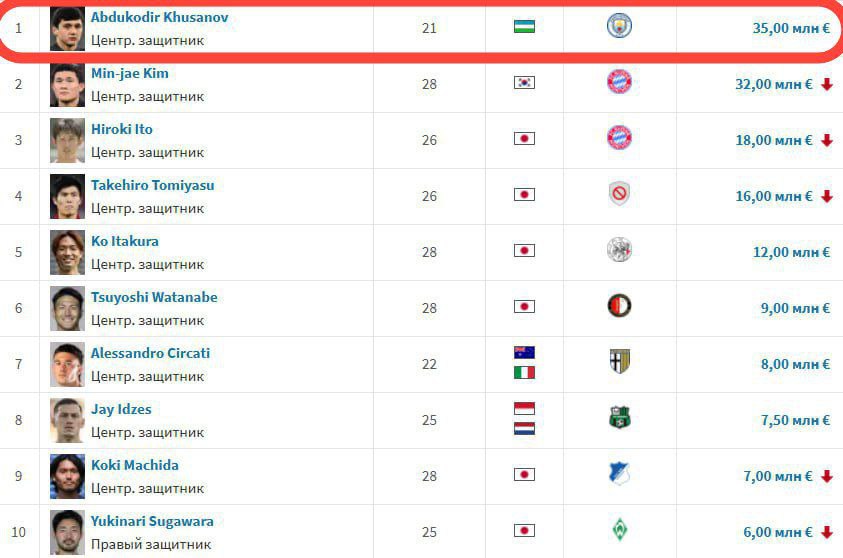 Ўзбекистон миллий терма жамоаси ва “Манчестер Сити” футболчиси Абдуқодир Ҳусанов Осиёнинг энг қиммат ҳимоячисига айланди. Бу ҳақда “Transfermarkt” портали маълум қилди.