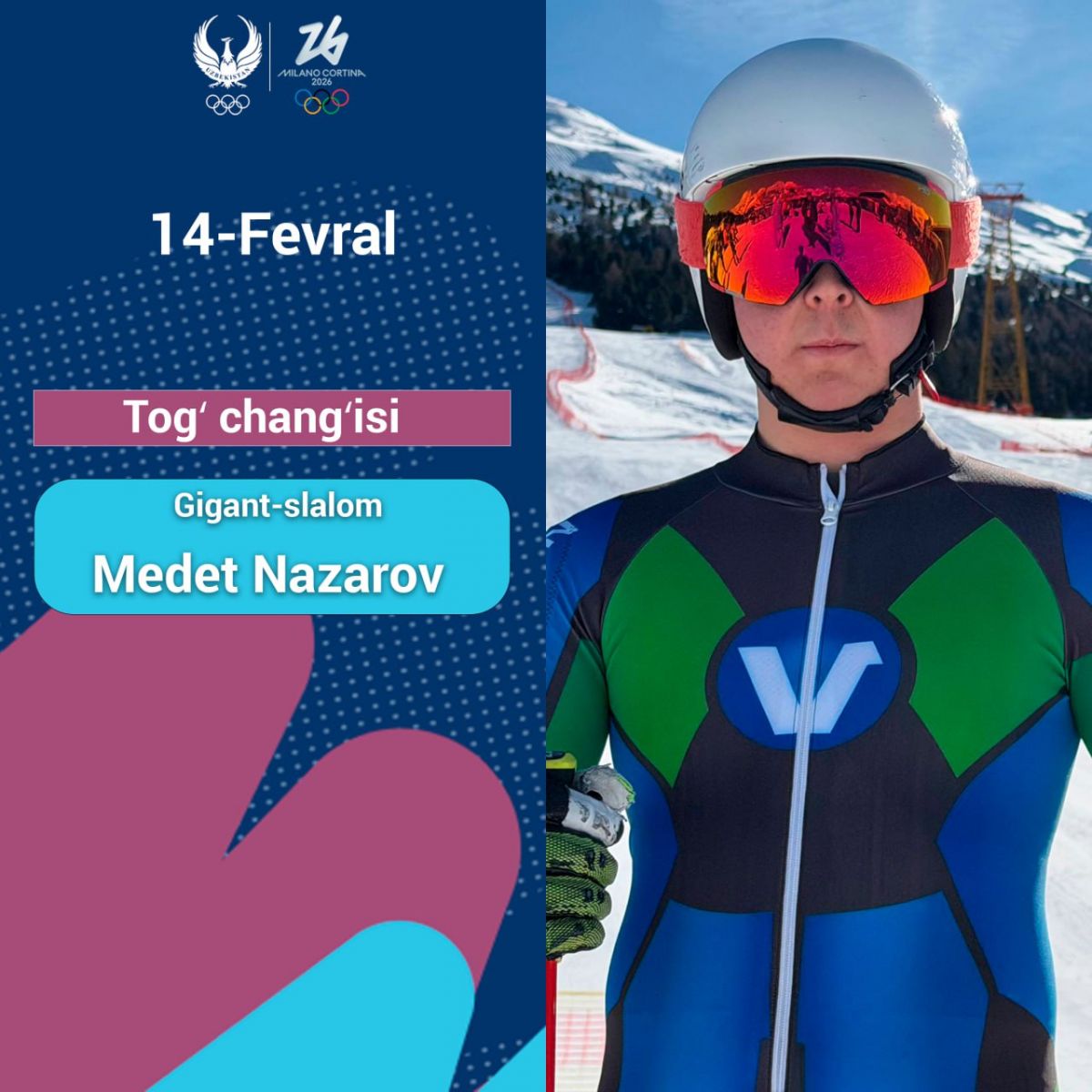 Бугун, 14 февраль куни Милан-Кортина – 2026 қишки Олимпия ўйинларининг расмий 8 кун баҳслари бўлиб ўтади. Кун доирасида ўзбекистонлик спортчилар Медет Назаров ва Даниил Ейбог Олимпиададаги иштирокини бошлайди.