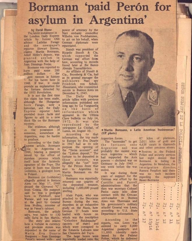 Hujjatlar Milliy sotsialistik nemis ishchilar partiyasi kansleri rahbari, Adolf Gitlerning shaxsiy kotibi Martin Bormanga tegishli. Uzoq vaqt davomida u Germaniyadan Janubiy Amerikaga qochib ketgan deb ishonilgan, ammo 1972 yilda uning qoldiqlari Germaniyada topilgan va 1973 yilda Germaniya hukumati uni o‘lgan deb e’lon qilgan. 1998 yilda o‘tkazilgan ekspertiza qoldiqlari Bormanga tegishli ekanini aniq ko‘rsatganiga qaramay, ba’zilar u qochib ketgan degan versiyaga amal qilmoqda.