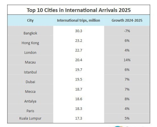 Valyuta omillari, xavfsizlik muammolari va mintaqaviy raqobatning kuchayishi tufayli 7 foizga kamayganiga qaramay, Bangkok 2025 yilda xalqaro tashriflar soni eng ko‘p bo‘lgan yo‘nalishlar ro‘yxatida yetakchilik qilmoqda. Keng infratuzilmasi, keng ko‘lamli tadbirlar taqvimi va raqamli sayohat xizmatlari tufayli shahar o‘zining yirik xalqaro turizm markazi maqomini saqlab kelmoqda. Gonkong 23,2 million turist (6 foizga o‘sish) bilan ikkinchi o‘rinda. Bu o‘sishga Kai Tak stadionining ochilishi, xalqaro aeroport terminalining kengayishi va xalqaro auditoriyani jalb qilgan yangi tadbirlar sabab bo‘ldi. London 22,7 million tashrif bilan (4 foizga o‘sish) bilan uchinchi o‘rinni egallab, yirik global markaz maqomini saqlab qoldi. Shaharning umumiy jozibadorligi reytingidagi pasayishiga qaramay, Buyuk Britaniya poytaxti xalqaro transport hajmida barqarorlikni namoyish etdi.